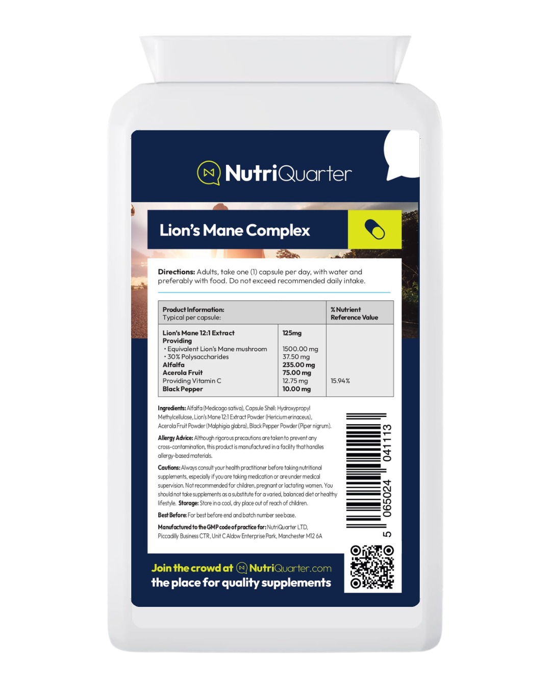 Ingredients: Alfalfa (Medicago sativa) Lion's Mane Mushroom Extract, Capsule Shell: Hydroxypropyl Methylcellulose, Acerola Fruit Extract, Black Pepper,