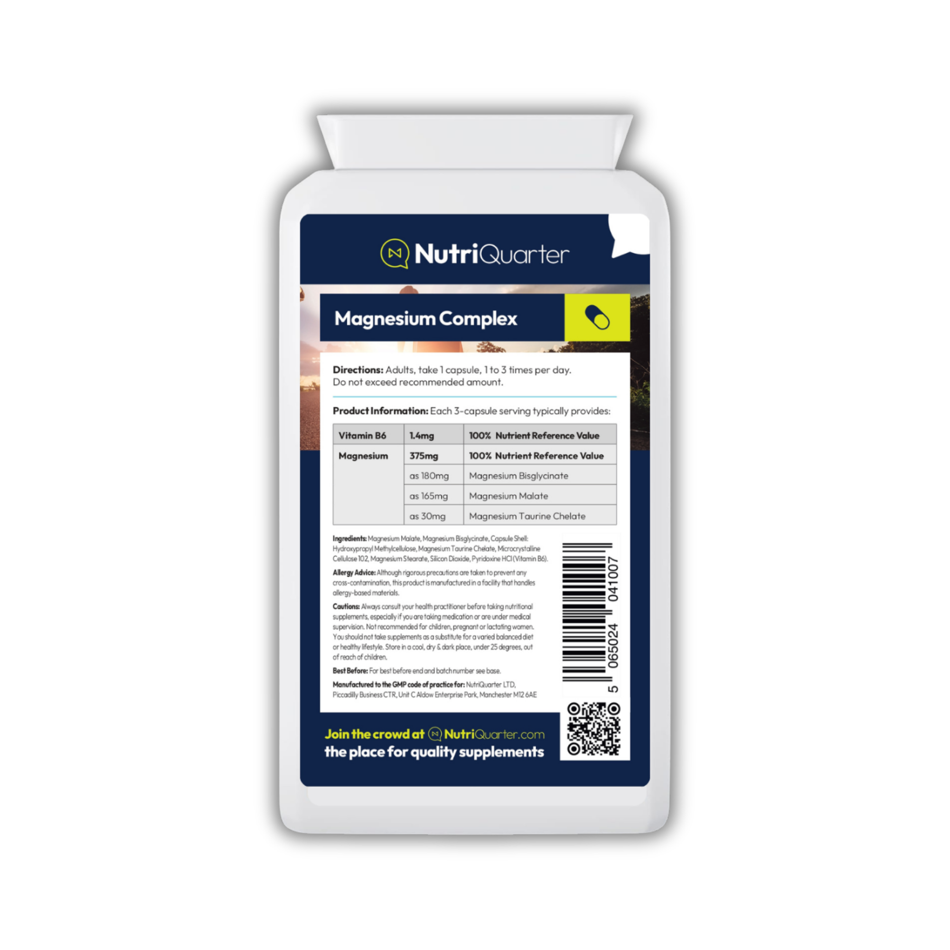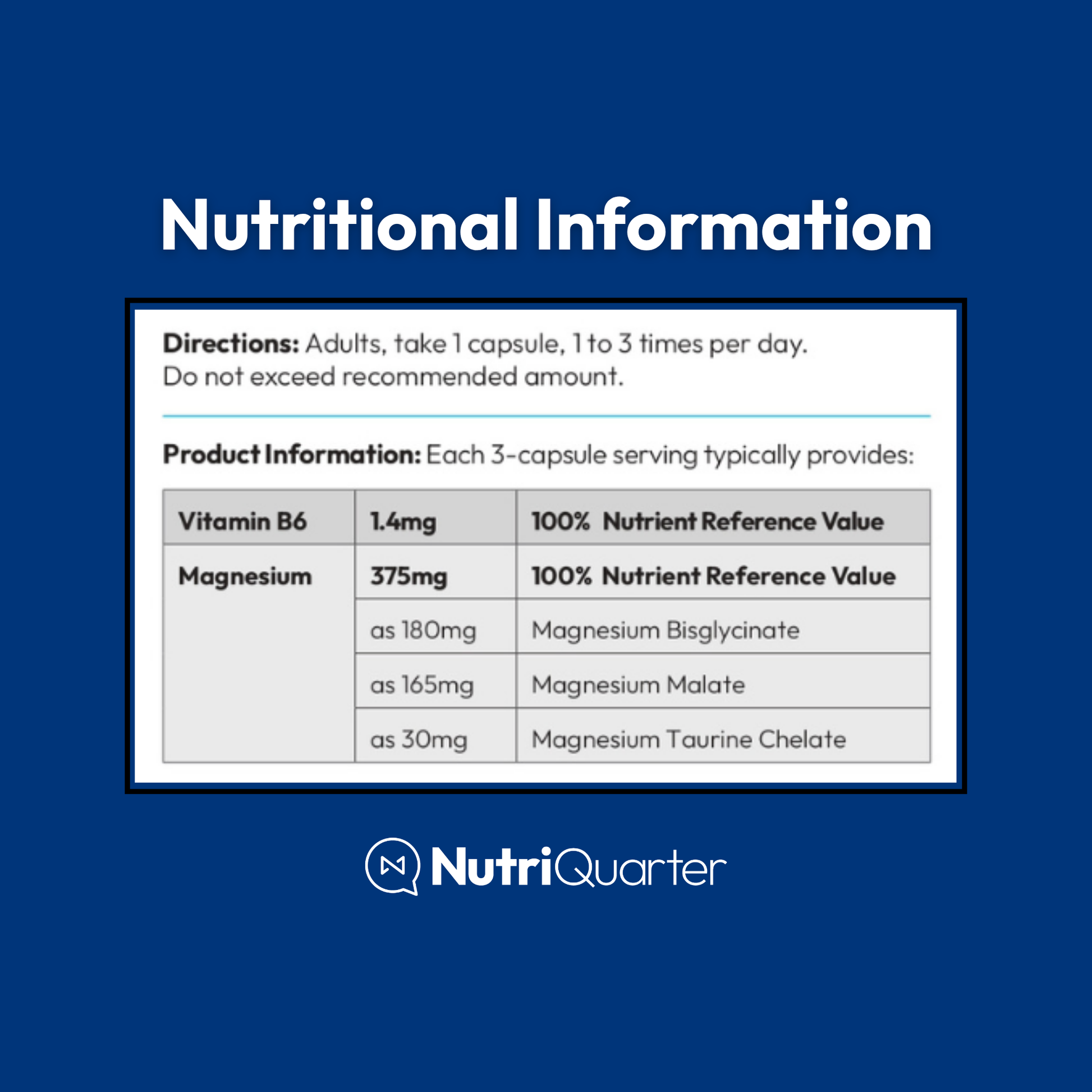 Ingredients: Magnesium Malate, Magnesium Bisglycinate, Capsule Shell: Hydroxypropyl Methylcellulose, Magnesium Taurine Chelate, Microcrystalline Cellulose 102, Magnesium Stearate, Silicon Dioxide, Pyridoxine HCl (Vitamin B6).