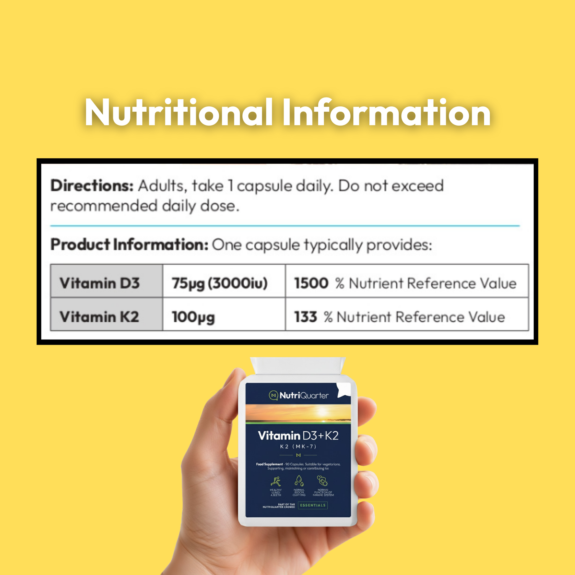 • Convenient daily capsules with 3000 IU D3 + 100µg K2 for effective support.